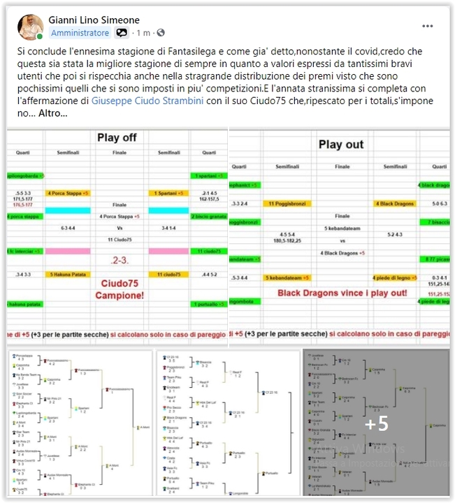 Si conclude l'ennesima stagione di Fantasilega e come gia' detto,nonostante il covid,credo che questa sia stata la migliore stagione di sempre in quanto a valori espressi da tantissimi bravi utenti che poi si rispecchia anche nella stragrande distribuzione dei premi visto che sono pochissimi quelli che si sono imposti in piu' competizioni.E l'annata stranissima si completa con l'affermazione di Giuseppe Ciudo Strambini con il suo Ciudo75 che,ripescato per i totali,s'impone nonostante partisse da 11esimo di girone e nonostante avesse,in ogni turno,i bonus a sfavore. Complimenti Giuseppe Ciudo S...