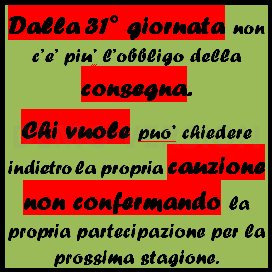 Con la consegna della 30a giornata decade l'obbligo di consegnare per cui tutte le non consegne effettuate non intaccheranno la cauzione versata che dunque ritorna a Vostra disposizione. Chiunque la rivoglia indietro non ha che da chiederlo tramite messaggio pvt o su whatsapp e sara' ricontattato. Questo e' anche il momento per disdire la propria partecipazione per la prossima stagione se avete gia' le idee chiare in merito.Io non posso che ringraziarVi per quanto avete dato quest'anno,ma ritengo anche giusto che se qualcuno vuole provare altre leghe si senta libero di farlo senza che l'amiciz...