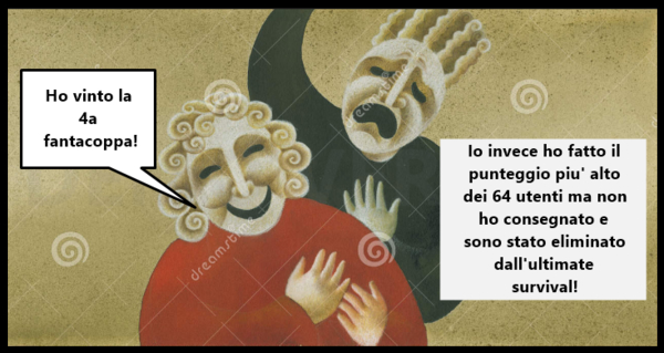 ..... da conferma che la piu' grande delusione di questa annata e' stata proprio lui con il suo Saw7.Mancato in termini di partecipazione,di consegne,di mercato,mancava solo la ciliegina sulla torta con l'ennesima non consegna che lo eliminava dall'Ultimate Sulvival nel quale invece avrebbe realizzato il punteggio piu' alto con oltre 95 punti che lo avrebbero tenuto in gioco per ancora a lungo vista la forma della squadra.Cose che mi fanno incazzare come utente e dispiacere come organizzatore,ma passeremo anche questa.Felice invece gioca probabilmente la giornata della vita in Fantasilega e co...