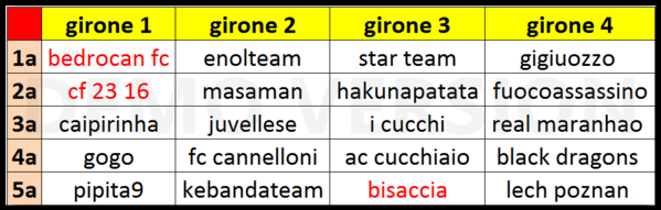 Semifinali: ritorno 34a giornata 1a c Casacarutas-La Mandrakata 2a b 4-3 1-2 aggregato 5-5 Partita davvero vissuta sul filo del rasoio,incredibili capovolgimenti di fronte e soprattutto incredibile la storia sulla rete,la 4a,del Bologna denominata la rete dalla doppia paternita' ovvero per molti autorete di Danilo per altri rete di Verdi. Si decide tutta qui la qualificazione perche' come succede nel migliore dei films trilling .... 4a c Juvellese-Fantabari 4a a 5-3 1-2 aggregato 6-5 Ma certo che questa Juvellese deve avere proprio un angelo custode in cielo o forse sara' il Fantabari che non lo tiene proprio visto quanto successo in questa seconda semifinale vinta dal Fantabari 2-1 ma che.....