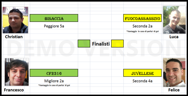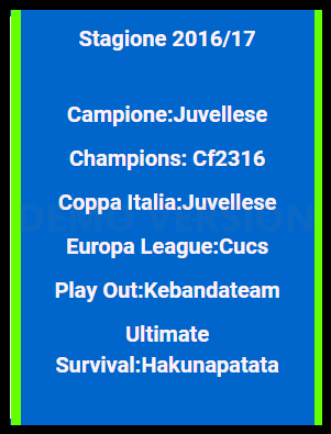 Lega aggiornata,commenti su tutte le finali,appena avro' tempo reinseriro' i tabelloni completi per lasciare in albo d'oro la migliore impagninazione possibile,per ora la home e' aggiornata e partono i complimenti per la Juvellese di Felix80 che ha schiantato 5-3 in finale il Cf2315 di Francesco Caranci.Al 3° posto Fuocoassassino di Luca Iannaccone a precedere il Bisaccia di Crhistian di Pinto terminato 4°. La Champions va a Cf2316 su La Mandrakata terminata 2a anche in Coppa Italia battuta dalla Juvellese.Play out ad appannaggio del Kebandateam di Francesco Stucchi che ha battuto Il padrino d...