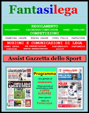 Lega aggiornata,mancano i commenti sui gironi che saranno realizzati nei prossimi giorni.In home di lega troverete tutto aggiornato a partire dai commenti sugli ottavi di finale di Coppa Italia appena conclusi.Aggiornata la classifica di qualificazione alla 4a fantacoppa e assegnati cambi e crediti extra per la giornata appena terminata.Nella 27a giornata si tornera' a giocare per le coppe europee,cominciano i quarti di finali che sono stati aggiornati anche per la Coppa Italia come da regolamento posizionando le qualificate in modo che la squadra con la classifica di entrata migliore giochi l...
