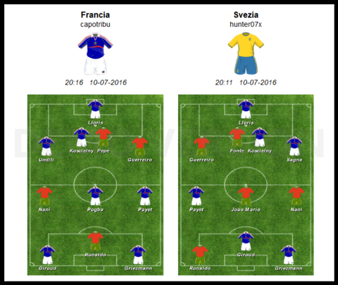 ..... come ampiamente previsto ci si giochera' la vittoria su pochi giocatori.Tanto Marco (Capotribu) che Alessandro (Hunter07x) avevano giocato benissimo risparmiando tanti cambi e alla fine le scelte erano quelle essendo rimaste due sole squadre a contendersi il titolo europeo,la Francia padrona di casa e il Portogallo di Ronaldo. 8 giocatori in comune,attacco uguale.Il primo giocatore diverso e' a Centrocampo dove Alessandro si gioca il portoghese Joao Mario a fronteggiare Pogba sul quale punta forte Marco.Anche il portiere e' uguale,Lloris,cosi come il modulo 433 per cui le altre due diffe...