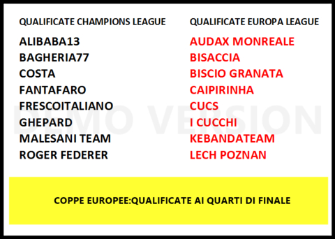 Giocate le gare di ritorno delle coppe europee e tranne clamorosi stravolgimenti derivanti dal comunicato del giudice sportivo,le 16 qualificate ai quarti di finale delle coppe europee sono le squadre esposte in questo cartello, in nero le qualificate per la Champions League,in rosso le qualificate per l'Europa League.