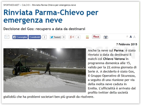 La partita Parma-Chievo e' stata rinviata per neve,e' arrivata anche l'ufficialita' a quanto sembra.La partita e' stata rinviata a data da destinarsi quindi al momento in cui sto' scrivendo non e' dato sapere quali sono i tempi di attesa prima di poter recuperare i voti reali.In Fantasilega c'e' un regolamento apposito per queste situazioni per cui qualora la partita venga recuperata prima della definizione dei vari eventi I VOTI SARANNO VALIDI A TUTTI GLI EFFETTI.