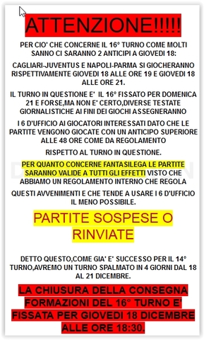 PER CIO' CHE CONCERNE IL 16° TURNO COME MOLTI SANNO CI SARANNO 2 ANTICIPI A GIOVEDI 18: