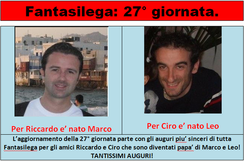 Come da oggetto della foto come prima cosa voglio ribadire i miei piu' sinceri auguri a questi due nostri amici che hanno,come si suol dire,messo a segno una vittoria importantissima nella loro vita.Benvenuti a Marco e Leo,le nuove leve di fantasilega!!ah ah ah Auguri vivissimi a Riccardo e Ciro e alle loro consorti!Detto questo partiamo con l'aggiornamento.La Home e' stata gia' tutta aggiornata con le nuove comunicazioni,i risultati dei quarti di andata delle coppe europee,con le nuove tabelle inerenti sia al premio Cantina Riccafana sia ai qualificati e ripescati attuali dei play off e dei p...