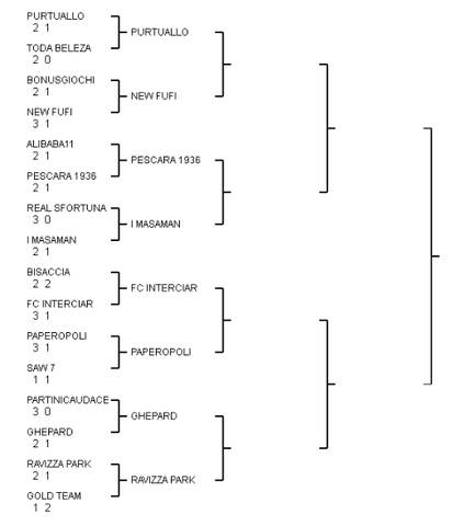 Ricordando che a questa competizione partecipavano tutte le 64 squadre della lega aggiungo che alla fine i valori espressi hanno fatto si che ai quarti di finale arrivassero 8 squadre che rappresentano quasi il top della lega per quanto espresso nei gironi del campionato.C'e' il RAVIZZA PARK 1° nel girone 1,ci sono PURTUALLO e I MASAMAN 1° e 2° del girone 3 passando per FC INTERCIAR e NEW FUFI rispettivamente 3° e 5° del girone 2.Dal girone 4 arrivano GHEPARD e PESCARA 1936 che occupano 1a e 3a posizione mentre diciamo che l'outsider che conferma la regola e' PAPEROPOLI che pero' attenzione,oc...