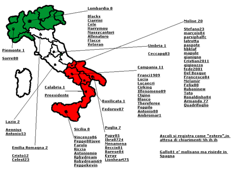 ..... Quasi definita la composizione,sono 11 le regioni rappresentate. Quel buongustaio di Ascoli si registra come "estero",sappiamo che e' un filo brasiliano,ma dove risiede qui in Italia? Gennaro facci sapere.