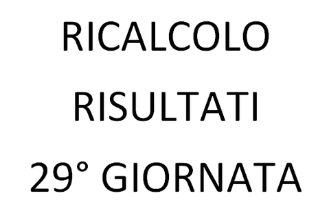 HO APPENA EFFETTUATO IL RICALCOLO DEI RISULTATI DELLA 29a GIORNATA INSERENDO I VOTI DEI GIOCATORI DI SAMPDORIA-INTER RECUPERATA IERI. OVVIAMENTE CI SONO ANCHE BONUS E MALUS A FARE DA CONTORNO.NON TROVERETE I SIMBOLI DI PORTA IMBATTUTA,DI GOL O AMMONIZIONI PERCHE' QUELLI IL SISTEMA NON LI INSERISCE MA AL FIANCO DI OGNI CALCIATORE TROVERETE COMUNQUE I DUE VOTI OVVERO QUELLO IN PAGELLA PIU' EVENTUALI BONUS MENO EVENTUALI MALUS.PRENDIAMO IL CASO DI HANDANOVIC: 7 IN PAGELLA MENO L'AMMONIZIONE PIU' 1 PER LA PORTA IMBATTUTA PRENDE ALLA FINE 7,5. AGGIORNERO' LA LEGA NEL POMERIGGIO PER CUI CHI VUOLE PU...