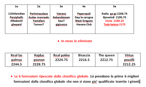QUESTE NELLO SPECCHIETTO SONO LE 24 SQUADRE QUALIFICATE AI PLAY OFF CHE SI GIOCHERANNO LA VITTORIA DELLA LEGA.SONO DISPOSTE IN GRUPPI DI QUALIFICAZIONE NEI GIRONI.TUTTE LE 1E,POI LE 2E E COSI VIA.PER STABILIRE LE MIGLIORI DEI VARI GRUPPI SI E' PRESA IN CONSIDERAZIONE LA CLASSIFICA A TOTALI CHE E' STATA SEGUITA ANCHE PER EFFETTUARE IL RIPESCAGGIO DI 6 FORMAZIONI DALLA STESSA.LE DUE 5e ELIMINATE DISPUTERANNO I PLAY OUT.LE QUALIFICATE SARANNO DISPOSTE IN TABELLONE STILE TENNIS COME INDICATO NEL SEGUENTE LINK:http://tinypic.com/view.php?pic=1zmjlv8& s=6