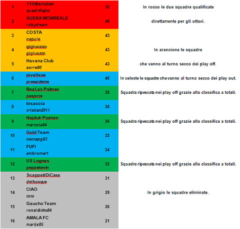 Gino ti dico di piu' per cio' che ti riguarda.Se tu adesso stessi nella posizione di Fc Tulipani saresti nei play out di diritto perche' la tua classifica totale di 1946,5 punti ti farebbe scalzare dalla seconda migliore 9a la squadra di mario,Fufi,che al momento sarebbe invece qualificata con 1927,25 punti su Fc Tulipani (1923,25) e Alcala Team (1921,25). Settimana per settimana riproporro' le nuove classifiche,potrebbe cambiare moltissimo in queste ultime 3 giornate,sono in molti quelli che possono e devono ancora provarci!