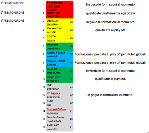 NELLA HOME DI LEGA HO INSERITO LA CLASSIFICA PERSONALIZZATA GIRONE PER GIRONE CHE INDICA POSIZIONE PER POSIZIONE LA SITUAZIONE DEI QUALIFICATI AL MOMENTO SIA PER I PLAY OFF SIA PER I PLAY OUT.INDICATE ANCHE LE FORMAZIONI CHE ANDREBBERO AL MOMENTO A PREMIO E LE 6 FORMAZIONI CHE SAREBBERO AL MOMENTO RIPESCATE PER LA LORO CLASSIFICA A TOTALI.SU IDEA DI CTGINO,SPERO DI FARVI COSA GRADITA VISTO CHE C'E' VOLUTO UN PO' DI LAVORO.