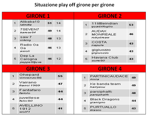 Con le classifiche dopo il 27° turno le due migliori quinte sarebbero Dep la Carogna e Havana club viste le classifiche a totali globali.Le squadre che,stando ai gironi non andrebbero ai play off,sarebbero ripescate dai totali al momento sarebbero:Hajduc Poznan,Realaspalmas,Paperopoli,Real Pakke,Us Lognes e The Queen.Le primissime escluse dai ripescaggi sarebbero Ravizza Park,Prisco e Djork.