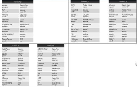 ..In primo luogo comunico che la lega e' gia' stata aggiornata.La home vi raccontera' al meglio la 27a giornata appena trascorsa e vi dira' cio' che accadra' nelle prossime giornate.Intanto sono strafelice,a 3 turni dal termine non c'e' ancora nulla di definito per nessuna posizione e in nessun girone:vuol dire che i gironi quest'anno li ho fatti proprio tosti,tutti e 4,al bando il sorteggio anche l'anno prossimo!Due risultati di rilievo pero' ci sono:11LITTLEINDIAN e GHEPARD sono quantomeno sicuri del 2° posto e quindi di un premio importante,complimenti a Angelo e Francesco,gli indiani, e Vi...