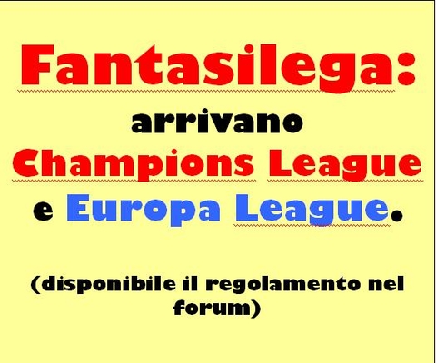 Nel forum troverete,oltre al tabellone play out con relative spiegazioni (inserite oggi anche per cio' che concerne il tabellone play off) il regolamento e lo svolgimento della nuova Champions League e della nuova Europa League,almeno per cio' che concerne la nostra lega.A domani per altri aggiornamenti.