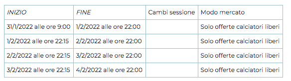 Una volta chiuso il calciomercato ci saranno varie sessione per il mercato di riparazione. Le sessioni saranno le seguenti: