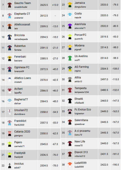 Queste sono le squadre classificate dalla 7° alla 38° posizione che si contenderanno il Premio di Consolazione a scontri diretti, è stato già creato il tabellone che troverete come al solito nella sezione Tornei.