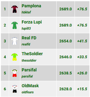 Si è conclusa velocemente anche la 30° GIORNATA di Campionato, il miglior punteggio settimanale è stato conquistato per la prima volta in questa stagione (e se non ricordo male probabilmente per la prima volta in assoluto) dalla formazione FC EVOLUX ECO di Luigiaston con 87,5 che ha avuto la meglio su Pajero che ha concluso la giornata a 84,5 punti. Luigi quindi con suo enorme stupore per l'impresa effettuata, si aggiudica la sostituzione e i 2 crediti previsti dal Regolamento.