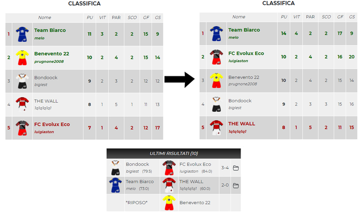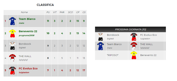 Cinque squadre in quattro punti e nessuna al momento è sicura di mantenere l'attuale posto in classifica. L'unica certezza è che Team Biarco non puo arrivare ultima; il resto è una serie infinita di combinazioni. Benevento riposa e dovrà affidare le sue sorti agli avversari. Bondook puo puntare al primo posto vincendo contro FC Evolux Eco e sperando che The Wall sgambetti Team Biarco; in questo caso anche 1q1q1q1q1 potrebbe puntare alla Champions arrivando a pari punti proprio con Team Biarco, e qui deciderebbe la classifica avulsa. Ma anche FC Evolux Eco ha la possibilità non solo di salvarsi...