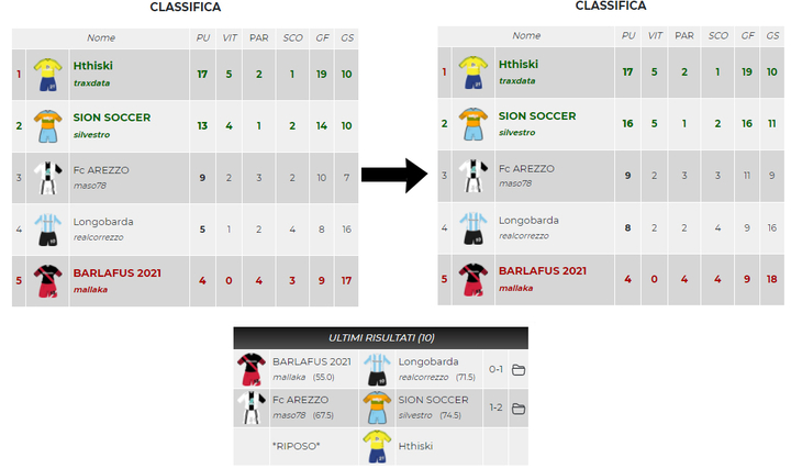 Longobarda si aggiudica lo scontro diretto per l'ultimo posto Uefa e condanna all'eliminazione Barlafus2021. Sion Soccer vince contro Fc Arezzo una partita che per la classifica non aveva nulla da dire. Anche in questo caso la classifica resta intatta. Champions per Hthiski e Sion Soccer; Uefa per Fc Arezzo e Longobarda; eliminazione per Barlafus2021.