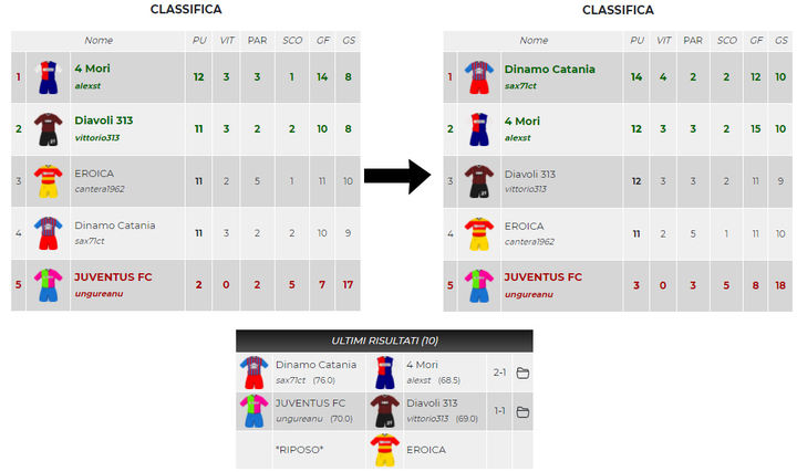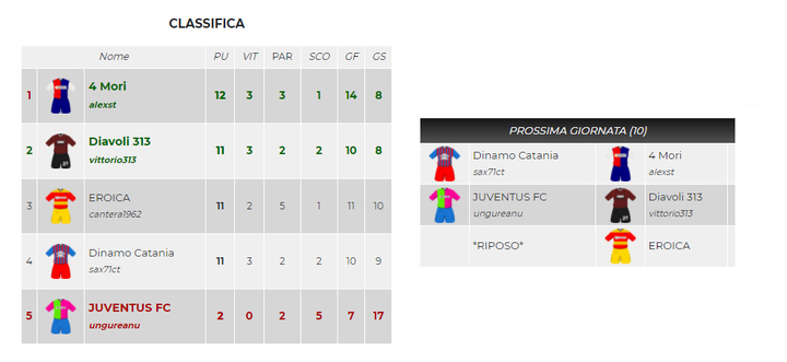 Qui non so da che parte iniziare, quattro squadre in un punto e le uniche certezze sono l'eliminazione di Juventus FC e il posto in Uefa di Eroica. Le altre compagini se la giocano pressoché alla pari nonostante il punto di vantaggio che 4mori ha su Diavoli313 e Dinamo Catania. Sarà un ultimo turno da non perdere.