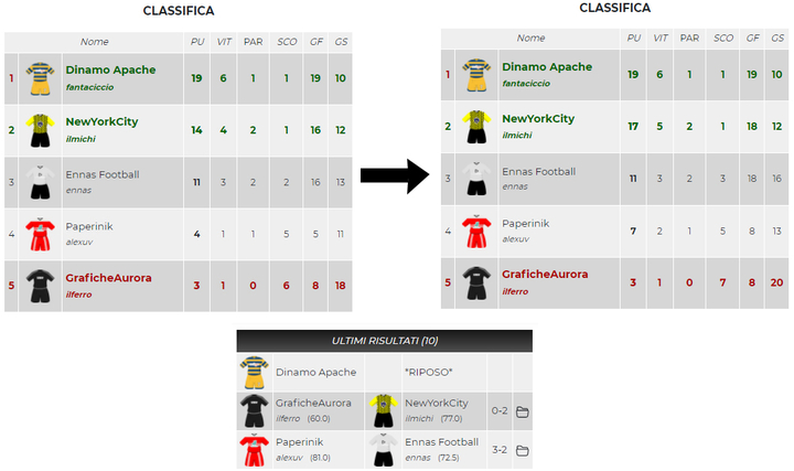 Classifica rimasta inalterata rispetto alla passata giornata. NewYorkCity vince contro Grafiche Aurora e mantiene il secondo posto che vale la Champions. Vittoria per Paperinik contro Ennas che spazza via ogni rischio di sorpasso da parte della de Ilferro. Champions per Dinamo Apache e NewYorkCity; Uefa per Ennas Football e Paperinik; eliminazione per GraficheAurora.