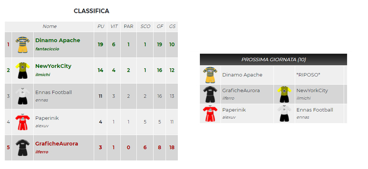 Dinamo Apache di riposo e già qualificato in Champions farà da spettatore. A NewYorkCity basta un pareggio contro Grafiche Aurora per garantirsi un posto in Champions. Ennas Football è già qualificato in Uefa ma puo ancora giocarsela per la Champions, dovrà vincere e sperare nella sconfitta di NewYorkCity. Paperinik dovrà vincere per avere la certezza matematica del suo approdo in Uefa, un mezzo passo falso potrebbe rimettere in gioco Grafiche Aurora proprio a scapito della squadra di alexuv.