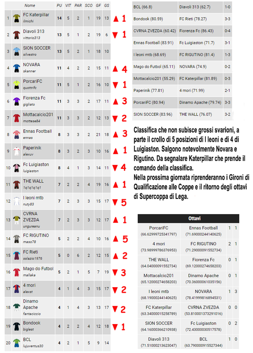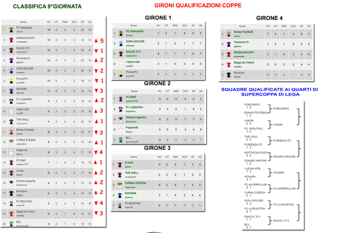 La situazione generale dopo la 9° giornata è questa riportata sopra. Vi ricordiamo che la Supercoppa di Lega è in pausa e l'andata dei quarti si giocherà nella 13° giornata. I gironi di Qualificazione alle Coppe si giocheranno invece per le prossime due giornate per poi essere messi in pausa. Domani, martedì, consegna formazioni entro le ore 19:00.