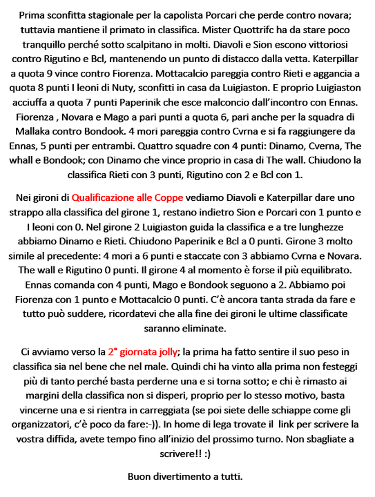 Ricordatevi che dopo la decima giornata avremo la 3° Giornata jolly; che dire......una settimanina tranquilla :))