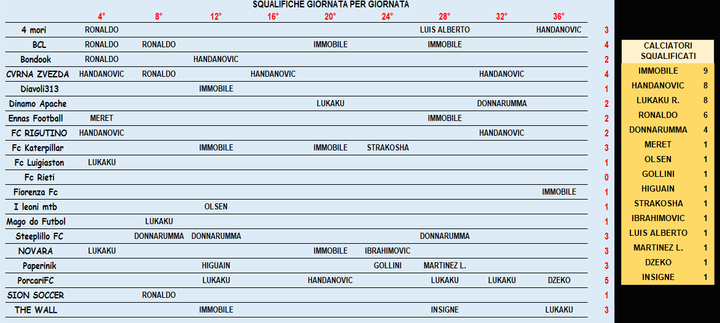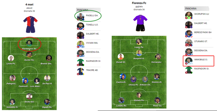 La squadra 4mori ha schierato Handanovic nonostante la squalifica. La squadra Fiorenza Fc ha schierato Immobile in panchina nonostante la squalifica. Abbiamo tolto i giocatori seguendo il regolamento di lega.