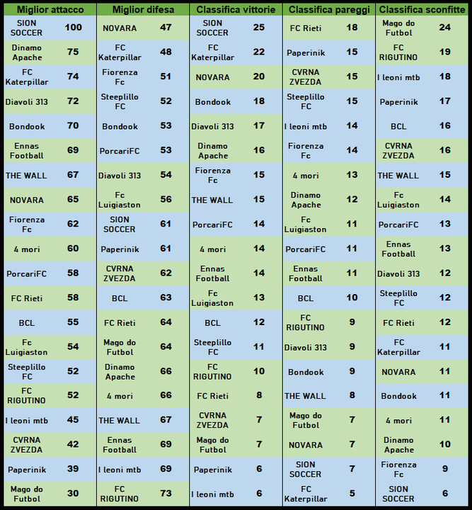 Sion Soccer stabilisce il record di vittorie consecutive (8), mentre la squadra con più sconfitte consecutive è Diavoli313 (7). Per quanto riguarda il record di pareggi consecutivi, appartiene a Fc Rieti (4). Qui sopra un po' di numeri di questa prima edizione di Fantajolly.