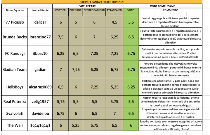 Sono state pubblicate le pagelle delle rose del 1° girone