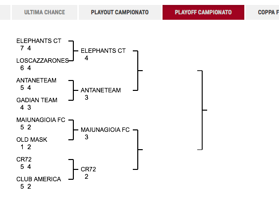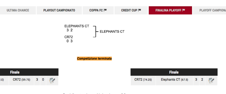 FINALINA PLAYOFF 3°-4° POSTO TRIONFA nella finalina dei PLAYOFF gli ELEPHANTSCT di ucatanisi @Carlo Fantacharlie che vince la FINALINA grazie alla larga vittoria della gara d'andata sul CR72 di stigteam a cui vanno fatti grandi complimenti per l'intero cammino avuto nel girone di campionato dove solo una lieve flessione nella parte finale che non gli ha permesso di avere un tabellone migliore per raggiungere la FINALE del 1°-2° posto!