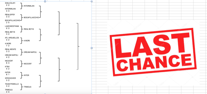 TORNEO ULTIMA CHANCE: Come vi avevo promesso in serata ho programmato il TORNEO ULTIMA CHANCE dedicato alle squadre classificate dal 9° posto al 13° posto più la migliore 14° squadra dei 3 Gironi di Campionato! Come successo per i PLAYOFF e PLAYOUT anche per il TORNEO ULTIMA CHANCE si è stilata una classifica dalla 1° alla 16° squadra dove gli abbinamenti saranno 1°-16° , 2°-15° e cosi via rispettando pero, per il primo turno della fase finale ovvero ottavi di finale, la clausola che due squadre appartenenti allo stesso girone non si incontreranno! La prima testa di serie è TRIBOLS di tale del...