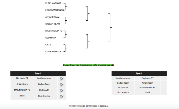 Si sono disputati gli Ottavi di finale della COPPAFC con partite ad alta tensione e molto equilibrate e inizio per congratularmi con le squadre che si sono qualificate per i quarti di finale! La prima tra queste è la regina del Girone3 di campionato Club America di stappatappi che ha la meglio sullo Zio Rino di rino66 grazie alla vittoria ottenuta nella 1° sfida del turno in trasferta e , dopo la rabbia per essere uscito nei PLAYOFF, potrà concentrarsi sui quarti di finale di coppafc!