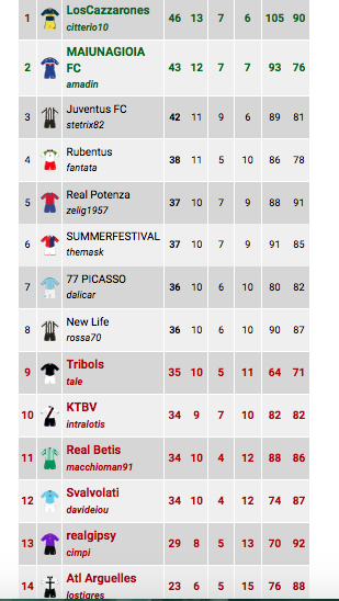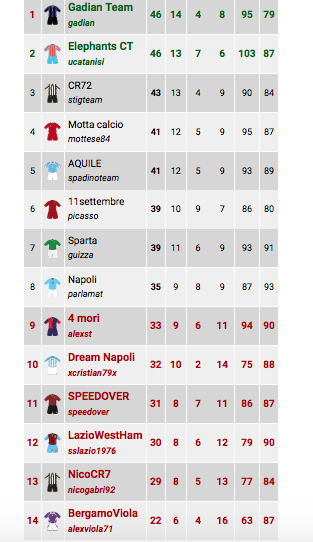 Al momento il 1° posto è condiviso tra due squadre, la prima è il Gadian Team di gadian che viene sconfitto da NicoCr7 di nicogabri92 che con 26 punti rimane in 13° posizione mentre per l'allenatore gadian i punti rimangono 43, gli stessi che ha raggiunto ucatanisi con i suoi ElephantsCT che paregg...