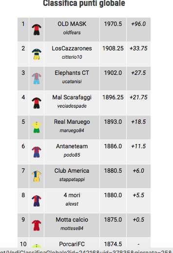 Ciao ragazzi, come saprete nella lega alla fine delle 37 giornate verranno premiati i primi 3 della CLASSIFICA GENERALE a punti che in questo momento comanda la super corazzata OLDMASK di oldfears con un vantaggio di 62.25 punti sulla seconda in graduatoria, ovvero i LOSCAZZARONES di citterio che presenta un minimo vantaggio sulla squadra che completa il podio , provvisoriamente, di questa classifica, gli ElephantsCt di ucatanisi!