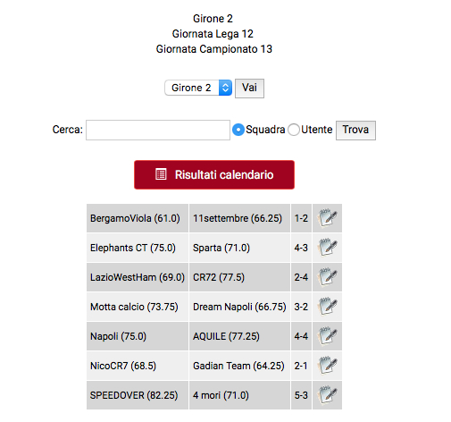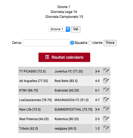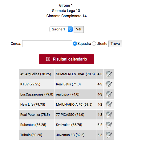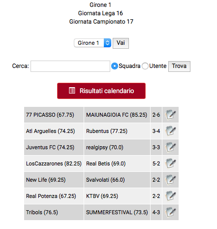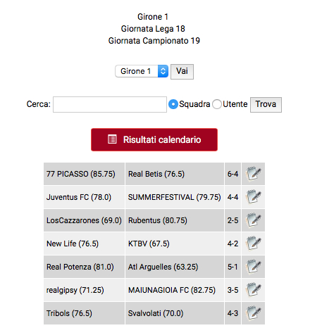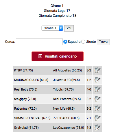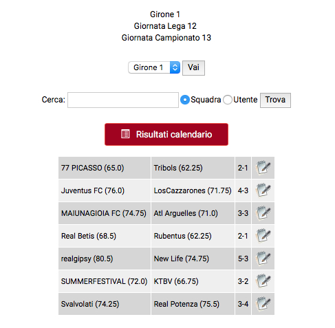 Con notevole ritardo ritornano i commenti relativi alle singole giornate della lega e del girone. Oggi parleremo del Girone 1 e dei risultati delle ultime 6 giornate! Vince la 12° esima giornata il Realgipsy di cimpi con 78.5 punti che sconfigge il New Life di rossa70 per 5 reti a 3! Parlando della zona di alta classifica vince il Real Potenza di zelig1957 che sconfigge una sfida delicata contro gli Svalvolati di davideiou e accorcia il distacco dalla testa della graduatoria occupata da citterio10 con i suoi LosCazzarones che vengono sconfitti dalla JuventusFC che accorcia la classifica a bene...