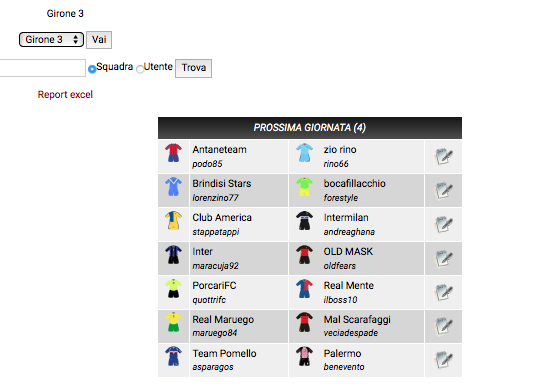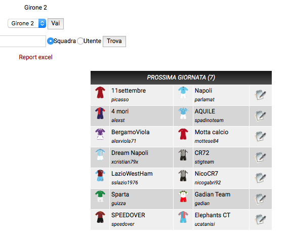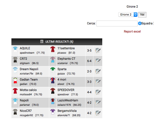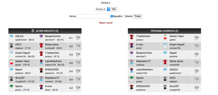 Sfida testa coda per la capolista del girone contro il DREAM NAPOLI di xcristian79x! Impegno in trasferta pure per il GADIAN TEAM di gadian che se la vedrà contro lo SPARTA di guizza! Il big match del girone è la sfida tra l' 11 settembre di picasso e il NAPOLI di parlamat localizzate nella zona medio-alta di classifica! Le quarte della graduatoria saranno impegnate in trasferta contro i 4MORI di alexst per le AQUILE di spadinoteam e contro lo SPEEDOVER di speedover per gli ELEPHANTSCT di ucatanisi! Sfida di bassa classifica tra MOTTA CALCIO di mottese84 e la BERGAMOVIOLA di alexviola71 mentre...
