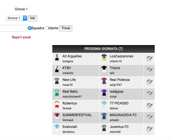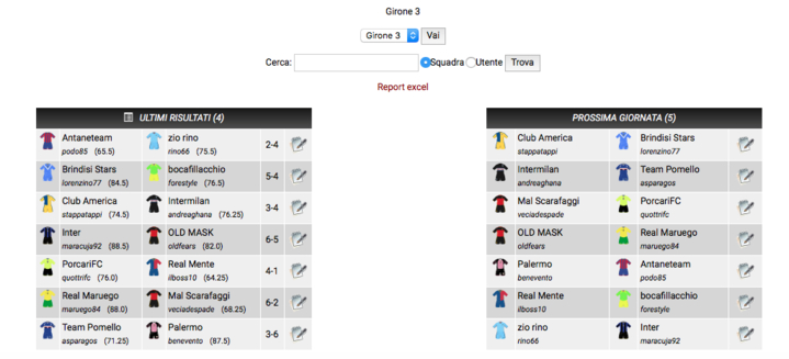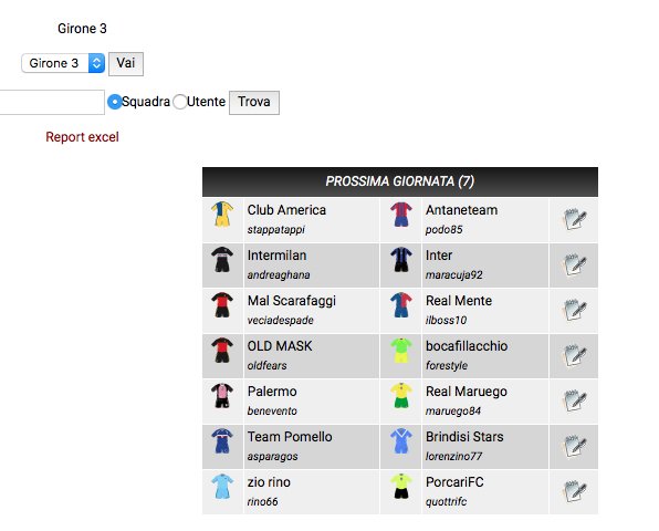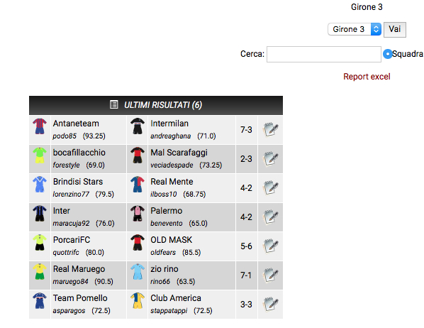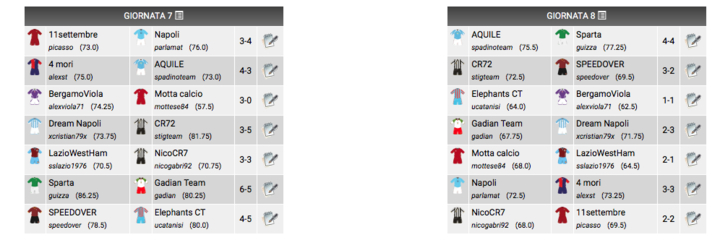 il BIG MATCH della 7° giornata è la sfida tra il CLUB AMERICA di stappatappi e l' ANTANATEAM di podo85 distaccate tra loro di un solo punto! Dovro approfittare di questo big match il BRINDISI STARS di lorenzino77 che se la vedrà con il TEAM POMELLO di asparagos! Lo Zio rino di rino66 e il Mal Scarafaggi di veciadespade guarderanno interessate le sfide e cercheranno di aver la meglio su PORCARIFC di quottrifc e il REAL MENTE di ilboss10 per poter guadagnare qualche posizione in graduatoria! Sfida tra le due INTER del girone tra andreaghana e maracuja92 mentre OLDMASK avrà impegno casalingo cont...