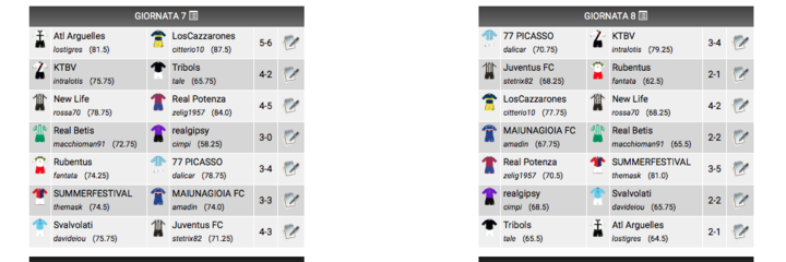 Il miglior punteggio settimanale del girone e della lega viene ottenuto da un a super prestazione dell' ANTANETEAM di podo85 che con i suoi 91.25 punti stravince la sfide contro INTERMILAN di andreaghana e lo stacca in classifica! CLUB AMERICA di stappatappi pareggia lo scontro di testa coda contro il TEAM POMELLO di asparagos e si fa raggiungere in classifica a 13 punti dal BRINDISI STARS di lorenzino77 che vince la sfida contro il REAL MENTE di ilboss10 per 4 reti a 2!