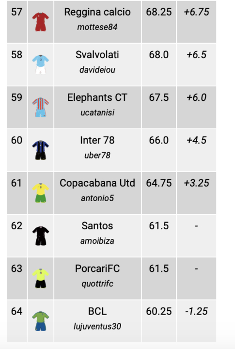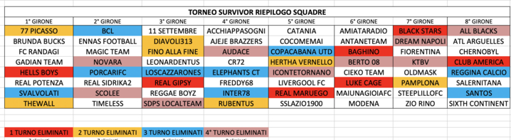 dalla grafica soprastante potete visualizzare gli eliminati del 4° turno del TORNEO SURVIVOR e abbiamo esclusioni eccellenti come quella dei ICONTETORNANO , AUDACE, NOVARA e via via tutte le altre fino a un totale di 9 squadre. Per visualizzare i punteggi basta andare nella sezione RISULTATI e cliccare su CLASSIFICA GENERALE e da li potete farvi un'idea più esaustiva dei punteggi di ogni squadra del turno in questione.