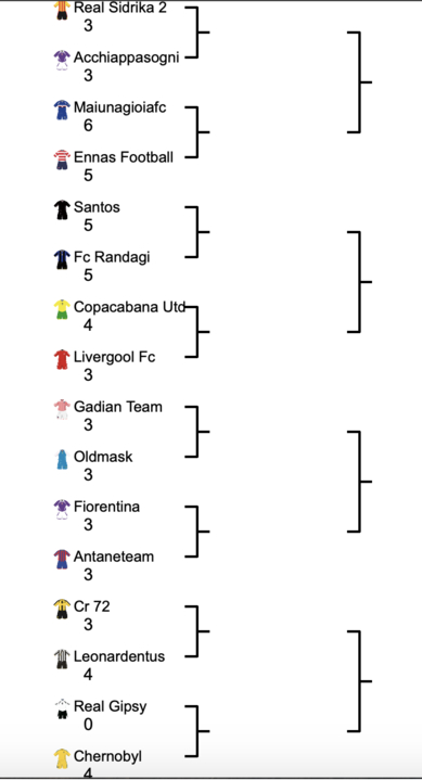 buongiorno ragazzi , questi sono i risultati ufficiosi del sito che pubblicato pochi minuti fa. Analizzando le varie partite le uniche due gare finite in parità nello scontro diretto sono quella tra Real Sidrika2 e Acchiappasogni e tra OldMask e Gadian Team: per quanto riguarda la prima sfida non dovro apportare nessuna modifica in quanto grazie ad un aggregato maggiore di punti nelle 2 sfide passa il turno l'Acchiappasogni di massibiro e si giocherà il passaggio alle semifinali contro un grande avversario, il MaiUnaGioiaFC di amadin che ha elimin...