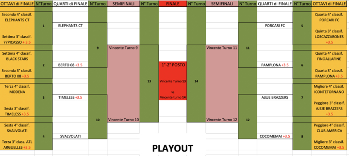 per quanto concerne i PLAYOUT invece sono finiti in parità due sfide su 8 ma in entrambi i caso grazie all'aggregato dei punti e senza utilizzare i 3.5 punti bonus BERTO 08 e AJEJE BRAZZERS si qualificano al turno successivo. Si qualificano come NON teste di serie l'Elephants CT grazie ai 6 totalizzati nella gara di ritorno, gli SVALVOLATI vincono la gara di ritorno e pure PORCARIFC passa il turno come quarta classificata del girone vincendo entrambe le sfide contro i LOSCAZZARONES!