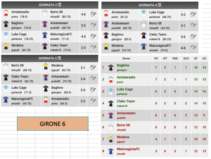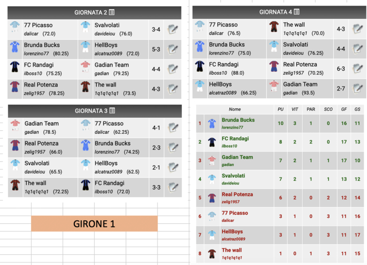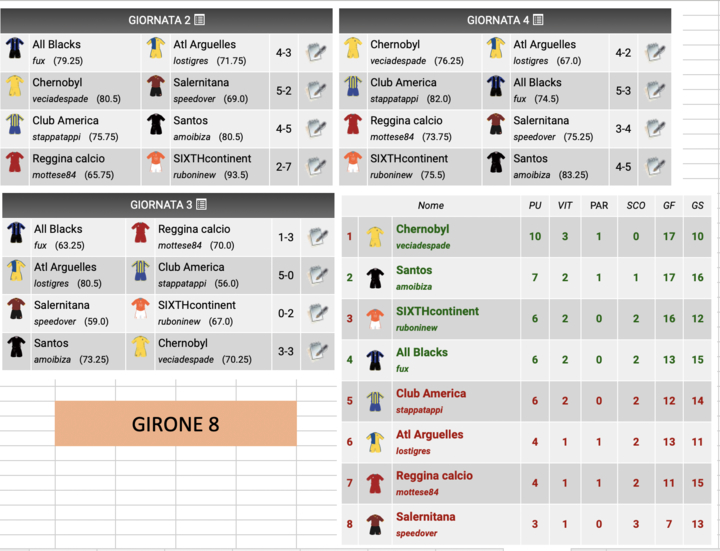 Girone 8 dopo 4 giornate disputate della lega:---------------------------------------- --------------------------------------------- ---------------- Inizio la trattazione del girone 8 facendo i complimenti al SIXTHcontinent del mitico nicando @Nicandro Fantaclub che ha totalizzato ben 93,5 punti alla 2° giornata che gli ha permesso di guadagnare i suoi primi 3 punti in graduatoria a discapito della Reggina Calcio di mottese84 @Mottese84 Roberto! Classifica comandata dal Chernobyl di veciadespade @Mattia Sandri FantaserieaFC che presenta al momento il miglior attacco e la miglior difesa del gi...