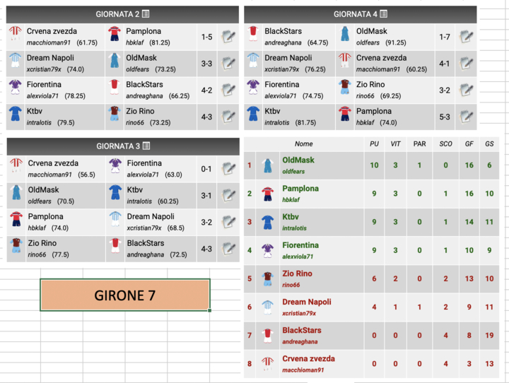 Girone 7 dopo le prime 4 giornate di lega: --------------------------------------------- --------------------------------------------- -----------------Nel Girone 7 tentano la fuga 4 squadre dove spicca l Old Mask di oldfears che ha totalizzato ben 10 punti ma si ritrova alle calcagne un trio molto agguerrito a un solo punto di distanza tra cui il Pamplone di hkblaf, il KTBV di intralotis e la Fiorentina del mitico alexviola71 , che dopo un anno di notevoli difficoltà , in questa stagione vuole dimostrarsi competitivo e lottare per le posizioni di vertice!------------------------------------- ...