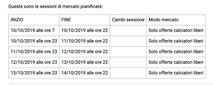 MERCATO di OTTOBRE:------------------------------------- -------------------------------------- Sono state pianificate le sessioni di MERCATO della FINESTRA del mese di OTTOBRE dove saranno valide le stesse REGOLE attuate nel mercato PRE-CAMPIONATO dove la più importante è quello di avere , al termine della 5° sessione, la ROSA COMPLETA....Potrete fare tutte le compravendite che volete e ho già aggiunto i 10 crediti extra previsti come da regolamento!