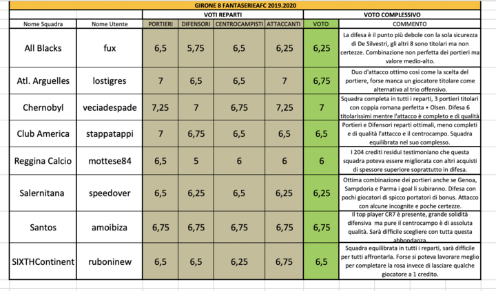 Sono state pubblicate le pagelle delle rose del 8° Girone