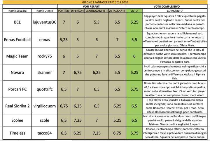 Sono state pubblicate le pagelle delle rose del 2°Girone